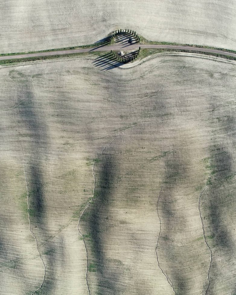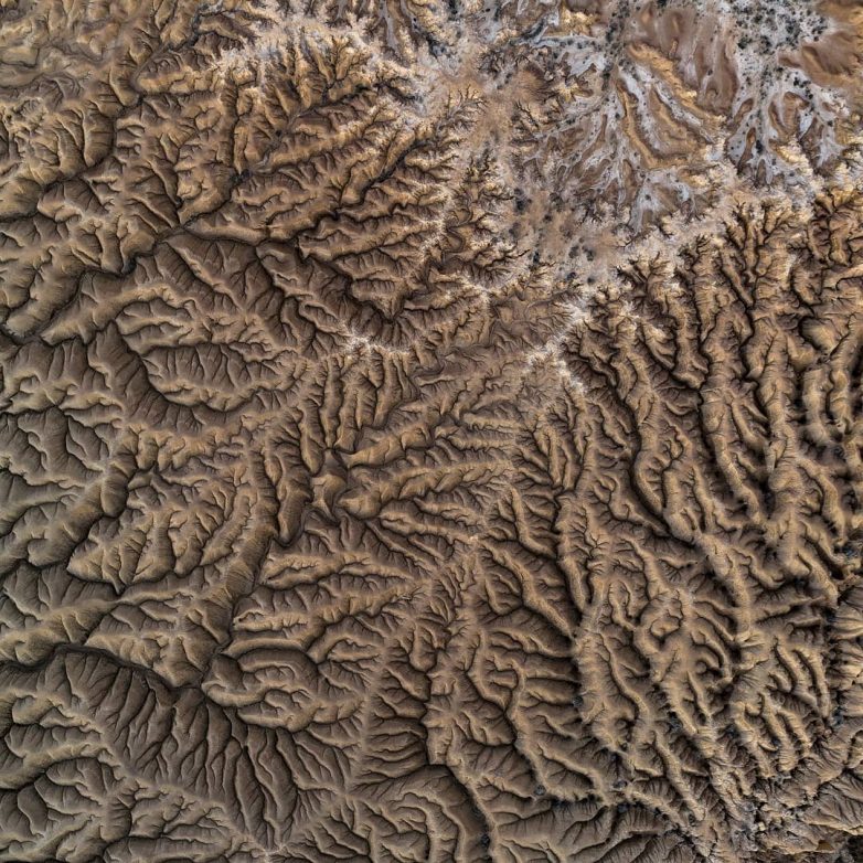 Фотограф снимает с помощью дрона, в результате чего получаются текстурные фотографии водяных насосов, кратеров вулканов, пустынных холмистых местностей сверху. Узоры, которые получаются под воздействием водяных отложений, опустевших либо же наоборот полноводных водоёмов, показывают нам всю красоту земли.