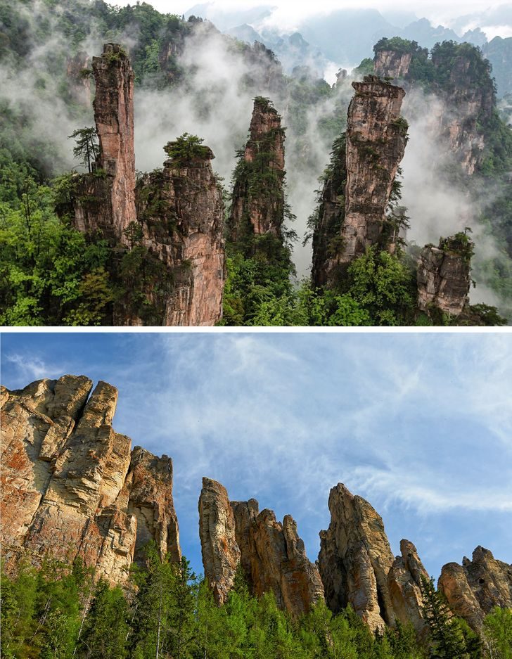 Часть горной системы Улиншань представляет собой многочисленные пики, столбы и утесы, образовавшиеся в результате выветривания песчаников. Именно их вы могли видеть в знаменитом фильме «Аватар». Аналогичный пейзаж можно встретить в парке «Ленские столбы» в России. Потрясающие скалы высотой до 100 метров ежегодно становятся только красивее из-за специфического климата.