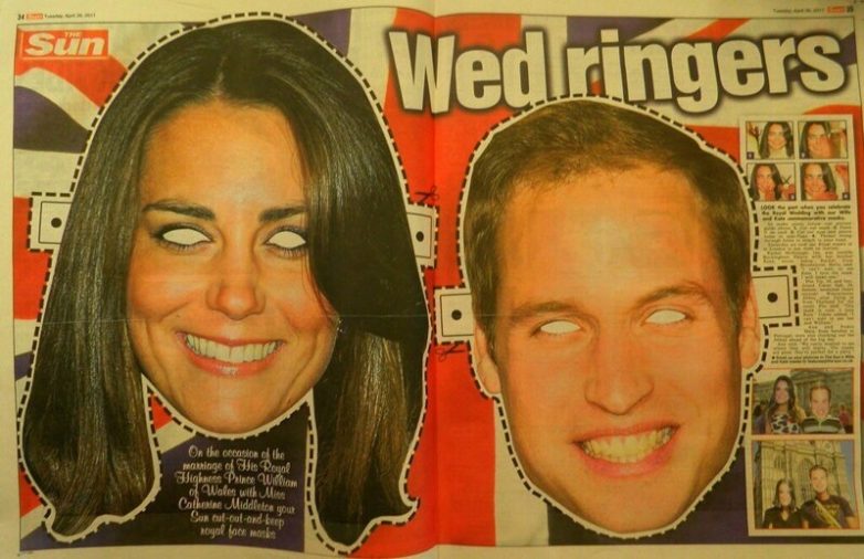 После того, как королева Елизавета II отпраздновала свой бриллиантовый юбилей, в одном из отелей Англии было обнаружено 18 масок королевы, 12 масок принца Филиппа, картонная фигура Кейт Миддлтон в полный рост и 36 флагов Великобритании.