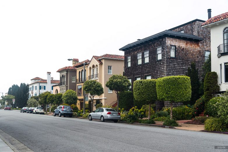 Не сходя с места можно изучить, как меняется архитектура от центра к окраинам города. 2-3 этажа — типичный максимум для жилой застройки в Калифорнии. Климат тёплый, поэтому дома не обязательно строить из камня. Но несмотря на обманчивую солнечность пейзажа, на океанском побережье постоянно дует ветер и даже летом прохладно. Для прогулок обязательно захватывайте ветровку, особенно вечером. Сочетание холодной воды океана и высокой температуры воздуха материковой части Калифорнии приводит к образованию Сан-Францисканского тумана, который летом может обволакивать город (особенно его западную часть, в восточных районах туман менее густой) целыми днями.