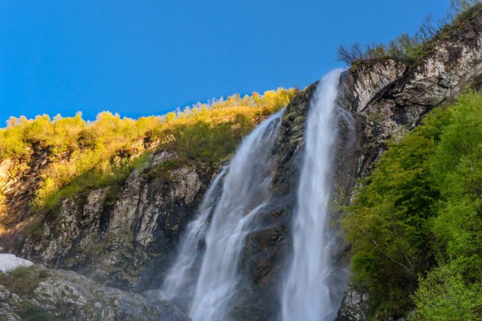 Высокий водопад в лесной зоне хребта Аибга близ Красной поляны. Даже в жаркие летние месяцы в этих местах лежит снег. Высота его составляет 70 метров. Он состоит из нескольких каскадов и падает вниз двумя крупными потоками, из-за чего у местных жителей получил название «штаны». К водопаду ведет автомобильная дорога, в 800 метрах от него расположена станция канатной дороги. Пеший маршрут прост и безопасен.