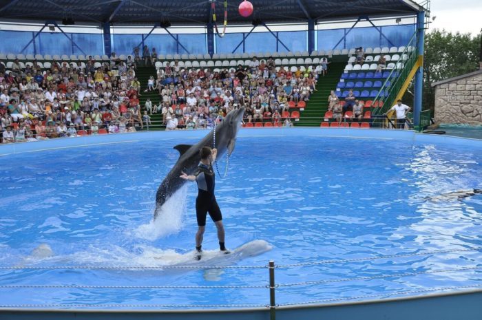 Трибуны для зрителей состоят из нескольких ярусов, которые вмещают около 1000 зрителей. Насладиться интересным шоу можно из любого сектора. Звездами представления по праву считаются дельфины-афалины. Они исполняют акробатические номера, танцуют, играют с мячом и рисуют картины. Также в шоу принимают участие морские львы и котики, полярные белые киты. После представления с морскими артистами можно сделать фото.