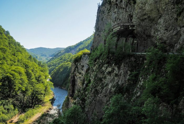 Глубокое ущелье, в котором в XIX веке проходила автодорога к Красной Поляне. Протяженность ущелья составляет 3 км, а высота скал составляет 800 метров. Расположение старой трассы впечатляет – с одной стороны взмывающие ввысь скалы, с другой – обрывистый склон, где бурно течет река Мзымта. Растут буковые и пихтовые леса. Неповторимый ландшафт привлекает многих туристов, устаивающих в ущелье необычные фотосессии.