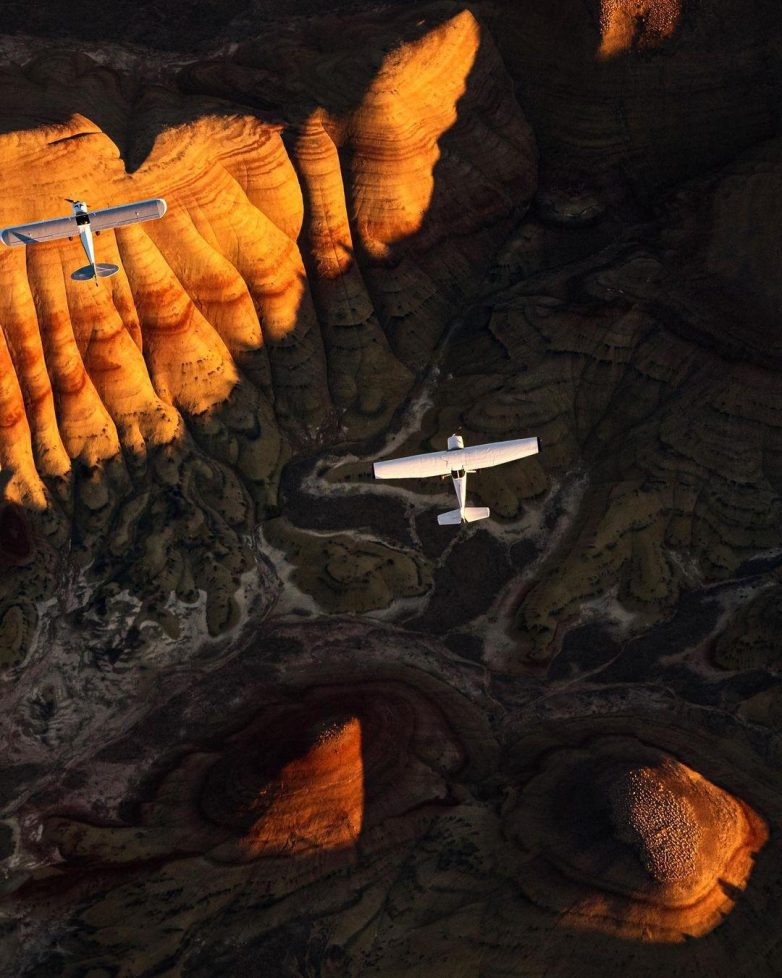 «Недавно я отправился в полёт с целью сделать снимок, сочетающий опыт авиации с одним из самых красивых и уникальных пейзажей Орегона —Раскрашенных Холмов. С высоты замысловатые полосы, красочные узоры Холмов становятся настолько „видимыми“. Жёлтая часть холмов относится к более сухому и холодному периоду времени, в то время как почва, обнаруженная в красных полосах, относится к более тропическому периоду времени. Благодаря совместным усилиям нескольких талантливых пилотов и тщательному планированию я смог сделать коллекцию фотографий на камеру без композитинга или блендинга», —рассказывает Эндрю.