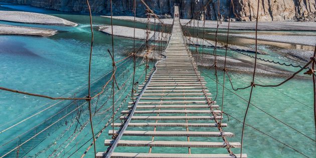 Если вам не страшно смотреть на Кэррик‑а‑Ред, просто имейте в виду, что до 1970‑х годов у него был только один верёвочный поручень и зазоры между досками, как у моста Хуссаини.