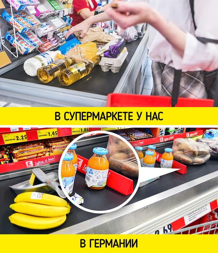 Эту особенность можно заметить в любом крупном продуктовом магазине Германии: товары покупателей на ленте у кассы будут строго разделены специальными планками. Турист, который по неопытности забудет использовать это приспособление, рискует получить весьма разгневанный взгляд в спину. Следующий в очереди человек, даже если его корзина перегружена покупками, не начнет выкладывать их на ленту, пока не дождется появления разделителя.