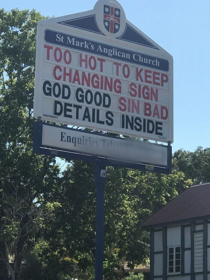 5. Рядом с англиканской церковью: «Слишком жарко, чтобы постоянно менять вывеску. Бог — хорошо. Грех — плохо. Подробности внутри»