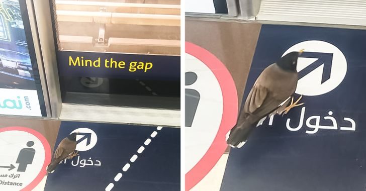 Птичка тоже, видимо, учила правила этикета. Преспокойно ожидает открытия дверей в метро