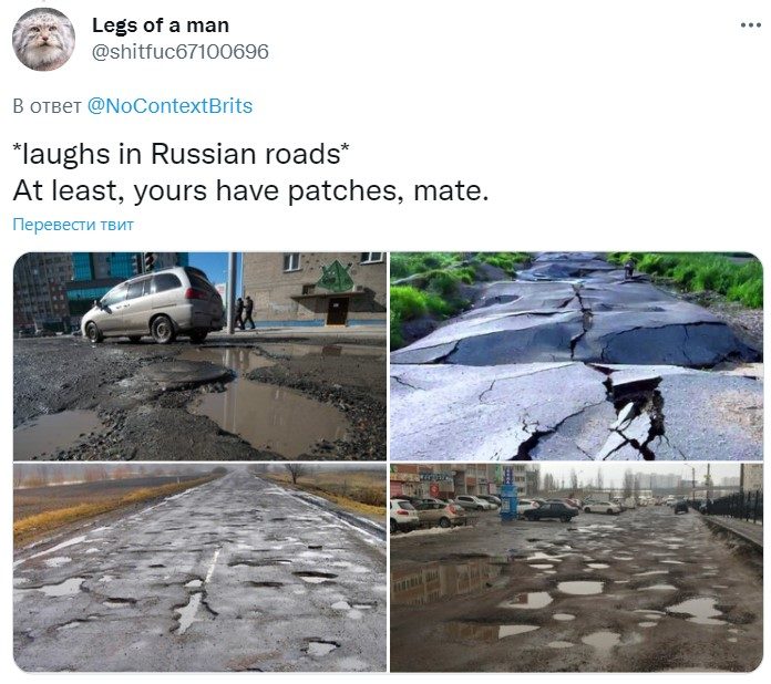 В Twitter-аккаунте No Context Brits, который нередко радует чисто английским юмором, появилась публикация с фото дороги, буквально усеянной заплатками. Подпись гласит, что так дорога может выглядеть только в Британии.