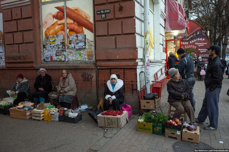 Уличная торговля. Здесь обратите внимание на то, как расклеены нелегальные объявления. Стены не трогают, все только на витринах или на водосточной трубе. Ну не прелесть ли?