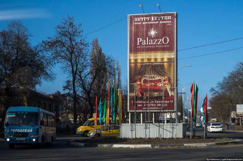 Соседнему зданию повезло меньше. Если в Пятигорске появляется возможность где-то разместить рекламу — эту возможность используют на 100%. Прямо Таймс-сквер.