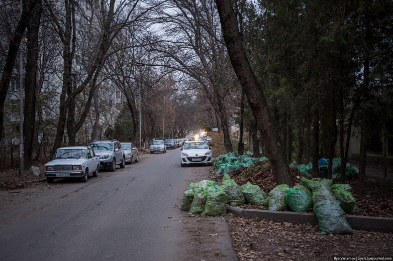 Обратите внимание — мусор в пакетах, на урнах тоже везде пакеты.