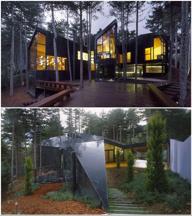 Если хотите увидеть дом, который уважает природу, тогда стоит заглянуть в лесную чащу, расположенную на склоне горы Сьерра-де-Гвадаррама. Футуристический, энергетически независимый особняк спроектировали архитекторы компании NO.MAD. Используя элементы нелинейной геометрии, специалисты компании умудрились втиснуть огромное здание площадью 400 кв. м между вековыми соснами на склоне горы так, чтобы оно гармонично вписалось в окружающую среду.