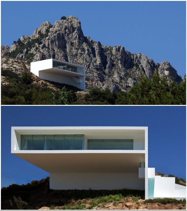 На одном из утесов, расположенных вдоль Средиземноморского побережья Испании, красуется белоснежный дом, созданный из монолитного бетона. Из-за крутизны участка и желания установить особняк только на одном уровне, архитекторы студии Fran Silvestre Arquitectos выбрали трехмерную конструкцию из железобетонных плит и экранов, полностью адаптированных под рельеф участка. Чтобы минимизировать влияние на окружающую среду и почву, в частности, фундамент занимает совсем небольшую площадь, большая часть здания «парит» над землей благодаря монолитной, каменно-анкерной конструкции и консольным элементам.