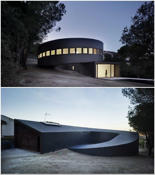 Архбюро Subarquitectura во главе с Дэвидом Фрутосом спроектировали круглый дом для большой семьи, закрученный по спирали, которая пожелала иметь загородный особняк на пологом лесном склоне. Благодаря нестандартному решению удалось сформировать отдельные жилые модули для всех членов семьи, при этом идеально интегрировать в ландшафт местности. Отделка фасада черным сланцем, обильное остекление в нужных местах и оригинальность форм стали сами по себе украшением, что избавило от необходимости создавать дополнительные декоративные элементы.