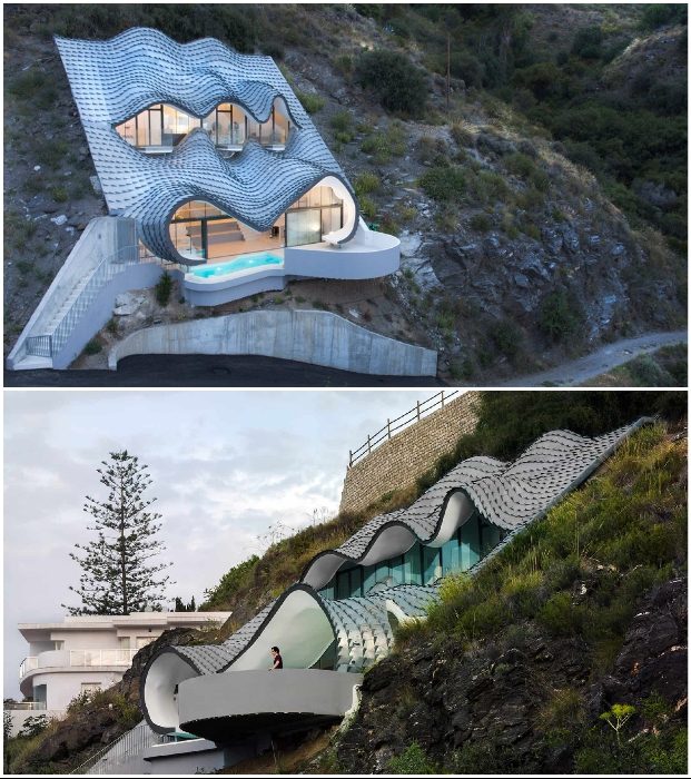 В итоге на склоне горы под углом 42 градуса построили причудливой формы дом из бетона с щедрым остеклением, благодаря которому открывается фантастический вид на Средиземное море. Дополнительным украшением участка служат рукотворные клумбы и сады с экзотическими растениями, консольный бассейн и волнистая крыша, напоминающая пену волн.