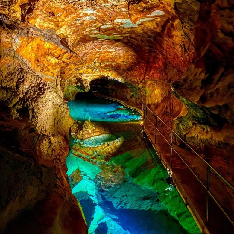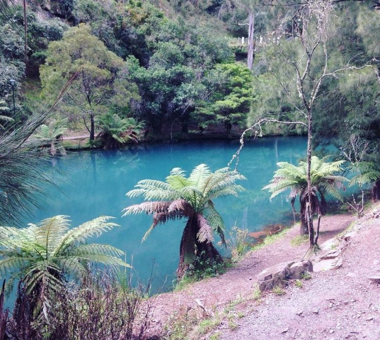 Яркая бирюзовая вода, которая выглядит так, будто ее покрасили неоновым пищевым красителем, течет через похожие на соборы пещеры в Голубых горах Нового Южного Уэльса.