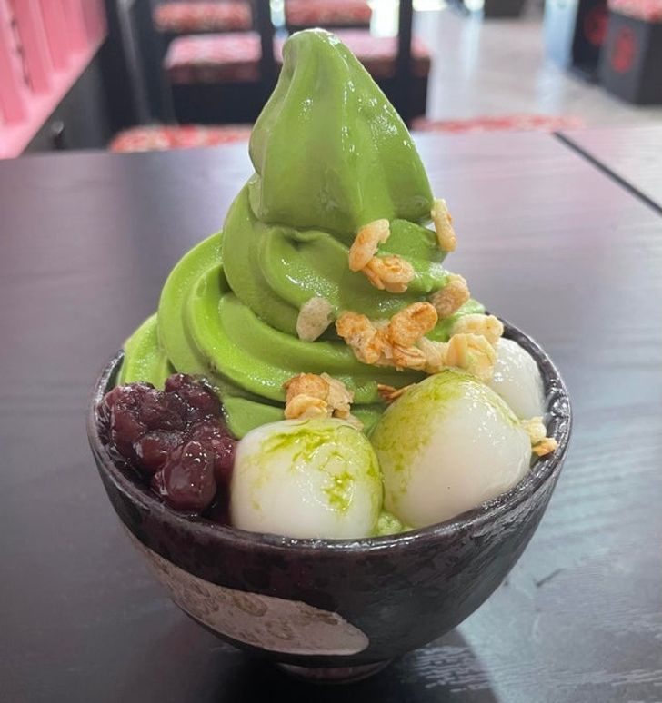 Матча парфе — десерт из моти, мороженого со вкусом матча с добавлением сиропа и агар-агара.