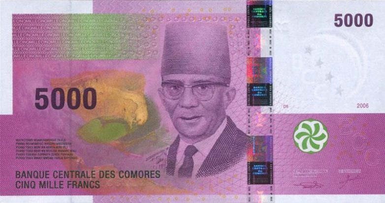 Франк Комор – денежная единица Коморы. Один франк состоит из 100 сантимов. Если говорить о 5000 франков Коморских островов, в центральной части находится портрет президента Комор 1992-1995 годов Саида Мохаммеда Джохара. Он умер в 2006 году в возрасте 87 лет.