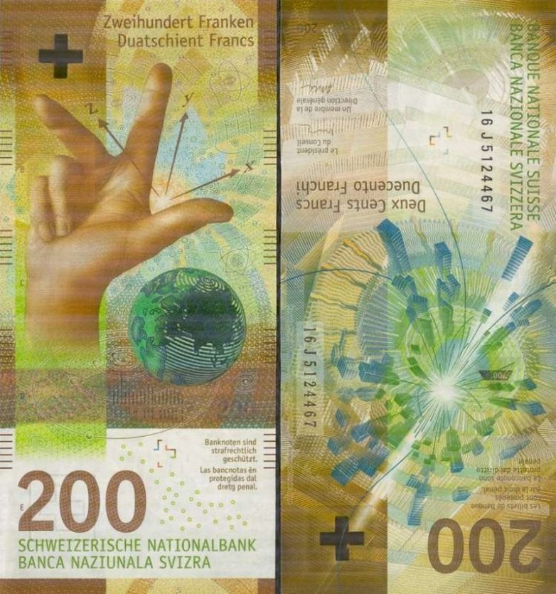 В 2018 году 200 швейцарских франков заняли на конкурсе «Самые красивые банкноты» 2 место. Примечательна банкнота тем, что надписи и изображения нанесены вертикально. На одной из сторон мы видим руку человека, который указывает пальцами в разные стороны.