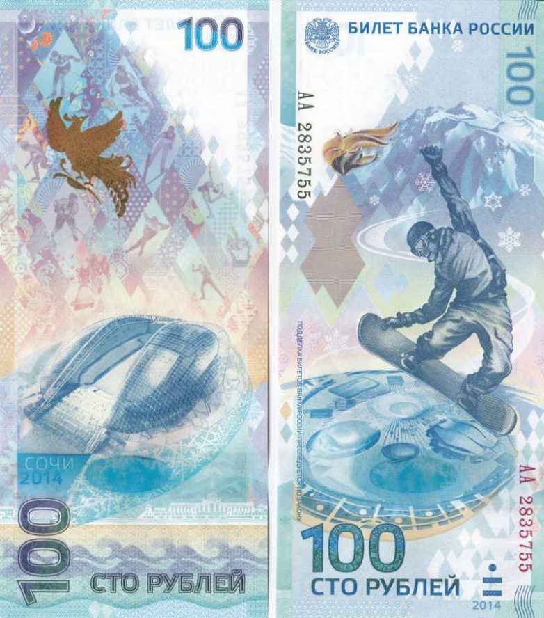 Речь идет о памятной купюре 2014 года в 100 российских рублей. Банкноту выпустили специально к Олимпиаде в Сочи, проходившей в 2014 году. Это первая российская купюра, дизайн которой был разработан нетривиально – картина развернута вертикально.