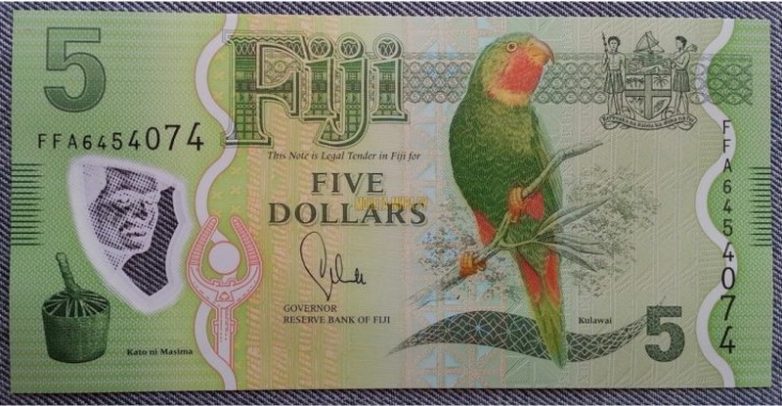 Эта купюра примечательна ярким дизайном. В правой части 5-долларовой банкноты Фиджи изображен попугай, сидящий на ветке. В верхней части орнаменты, название страны. Как мы видим, банкнота изобилует местной флорой и фауной – этих животных в Фиджи действительно много.