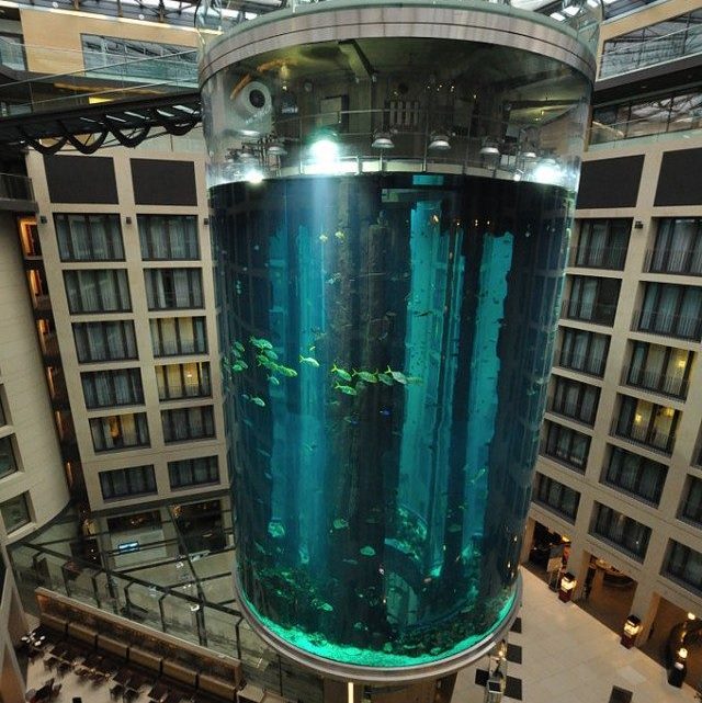 В Берлине находится самый большой в мире цилиндрический аквариум высотой 25 метров. В него встроен прозрачный лифт, позволяющий людям насладиться видом водного царства изнутри.