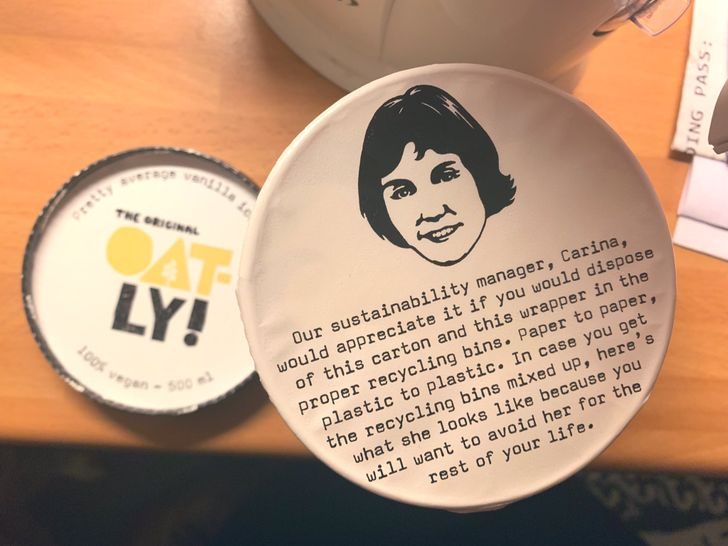 «Наш менеджер по устойчивому развитию Карина будет признательна, если вы поместите эту картонную коробку и обертку в соответствующие контейнеры для вторичной переработки: бумагу к бумаге, пластик к пластику. На тот случай, если вы все же перепутаете контейнеры: вот так выглядит Карина, и она не оставит вас в покое до конца дней».