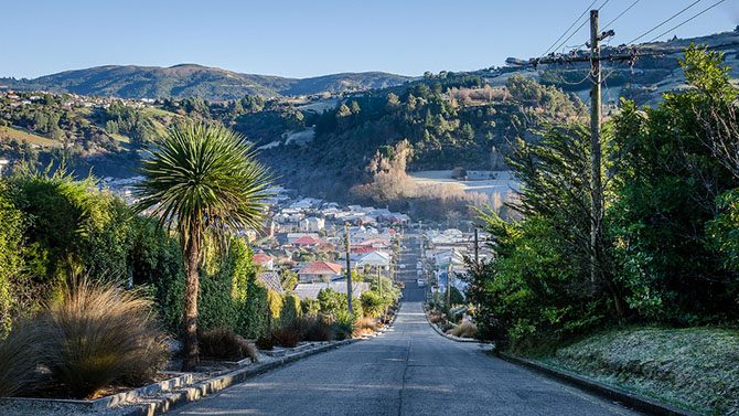 Улица Болдуин, или Baldwin Street, которая находится в городе Данидин в Новой Зеландии, официально признана самой крутой улицей в мире и внесена в Книгу рекордов Гиннеса. Угол ее наклона достигает 19 градусов или 35-процентный градиент, то есть дорога поднимается на один метр в высоту через каждые 2,86 метра.