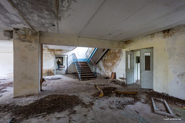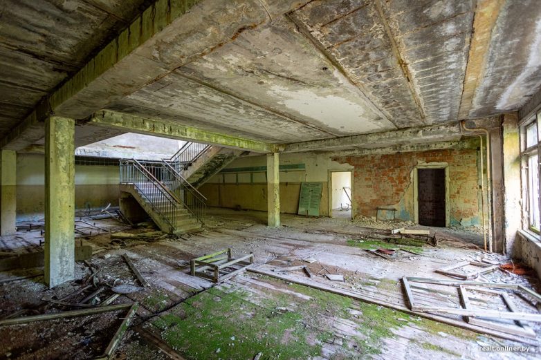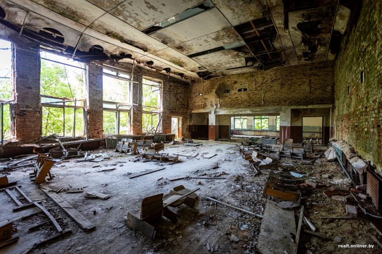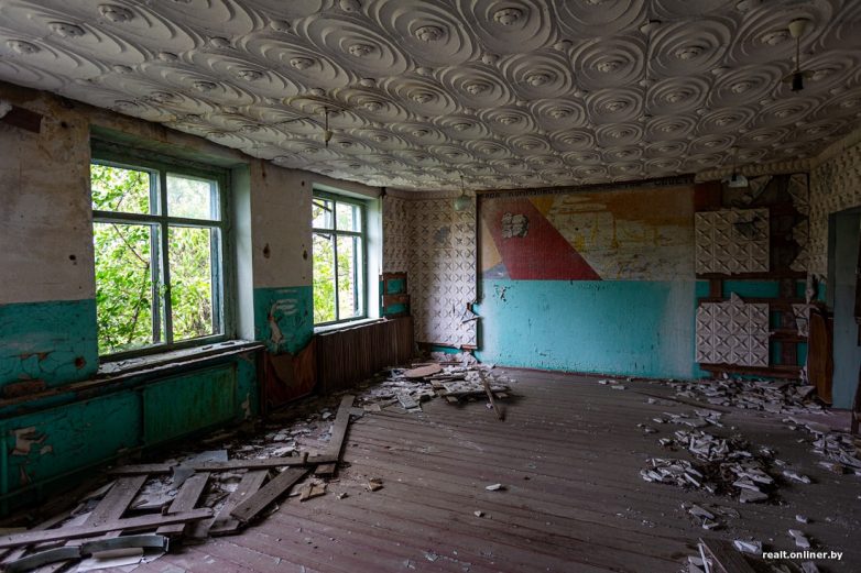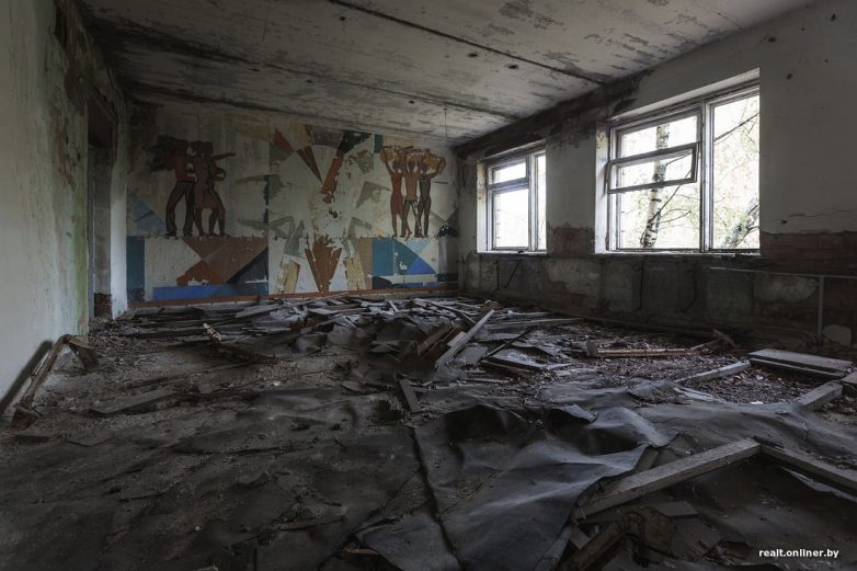 Единственное место в белорусской зоне отчуждения, где можно посмотреть заброшенные четырехэтажные дома. Наш проводник рассказывает, что Солнечный создавался в середине 1980-х как образец «деревни будущего». Рядом строился крупный животноводческий комплекс. Молодых специалистов приглашали со всей страны, давали работу и бесплатное жилье в новых многоквартирных домах. В Солнечном была своя школа, торговый центр, заканчивали строить Дом культуры, которому позавидовал бы любой белорусский райцентр.