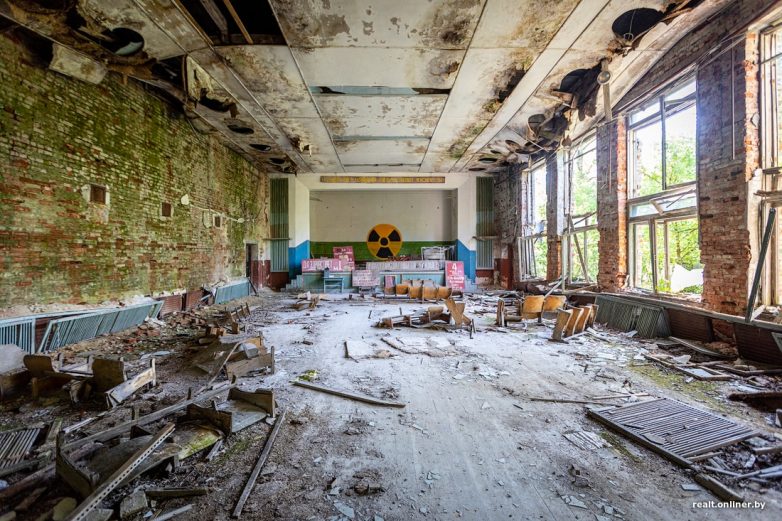 Сегодня сцена актового зала превратилась в фотозону со старыми плакатами. Позади советских лозунгов — большой знак радиации на стене (весьма спорная, на наш взгляд, идея от минской турфирмы).