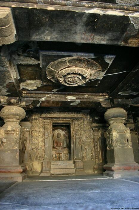 Статуи Будды и филигранные резные узоры украшают буддистские монастыри, созданные в глубине скал (Эллора, Индия).