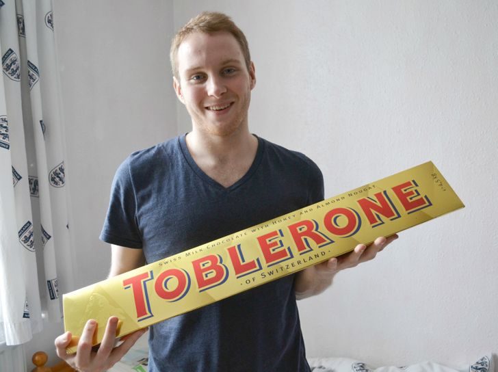 Toblerone — шоколадный батончик, расфасованный в виде долек из сладких пирамидок, напоминающих культовую гору Маттерхорн. Обычно батончики весят 150 г, а тот гигант, что на фото выше, весит 4,5 кг (Прим. AdMe.ru).