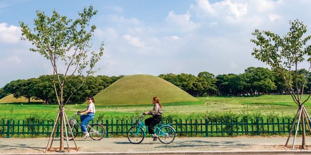 Кёнджу — один из туристических центров Кореи. Четыре части города внесены в список объектов наследия ЮНЕСКО. Сюда приезжают, чтобы посмотреть на руины храмов, центр буддизма, древнюю обсерваторию Чхомсондэ и парк королевских захоронений Тэрынвон. Объехать все достопримечательности за один день можно на велосипеде. Длина маршрута — 23 километра. Кроме памятников старины, он охватывает и красивые природные объекты — озеро Помун и парк Хвансон.Дорога займёт всего три с половиной часа. После велопрогулки можно побродить по городу, попробовать местные булочки хваннамппан и посмотреть на корейскую традиционную борьбу ссирым.
