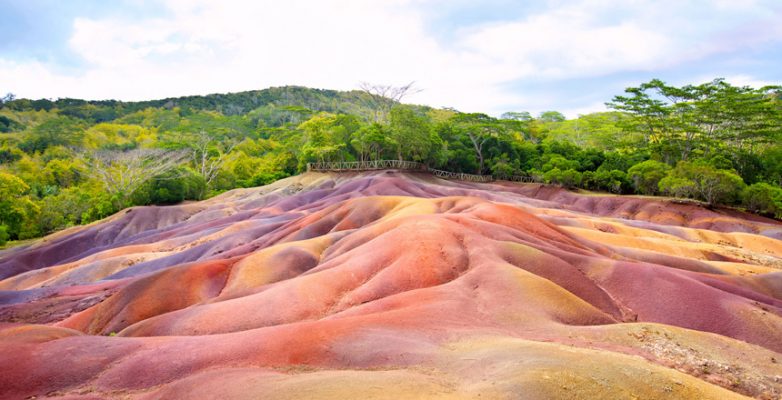 На юго-западе Маврикия находится одна из главных достопримечательностей острова — местность Шамарель. Это комплекс, где расположен водопад и «Семицветная земля» (Seven Coloured Earth in Chamarel). Там со скалы с огромной высоты 100 м в заросший лесом кратер вулкана низвергается грандиозный поток воды, потрясая своей мощью. Поблизости среди буйной зелени путешественникам открывается участок земли в виде плотных гладких волн красного, желтого, фиолетового, зеленого, оранжевого оттенков. Особенно четко многоцветье заметно на рассвете и в дождь на мокрой поверхности. Этот феномен — результат давней деятельности вулкана и эрозии. Говорят, земля в сувенирных баночках после встряхивания вновь ложится ровными полосами в семь цветов.