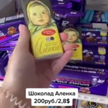 В ролике автор показывает продукты российского производства. Так, 60-граммовая шоколадка “Аленка” стоит больше двухсот рублей (или 2,8$). За упаковку копченого сыра “косичка” можно заплатить в полтора раза больше – 4,7$. Больше пятисот рублей вы отдадите за обычную банку консервированной тушенки.