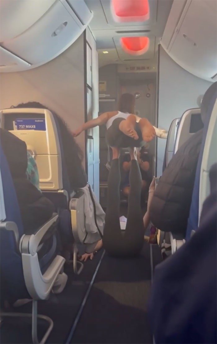 Ничего особенного, просто женщина кормит своего кота с рук, пока он смотрит телевизор. На борту самолета.