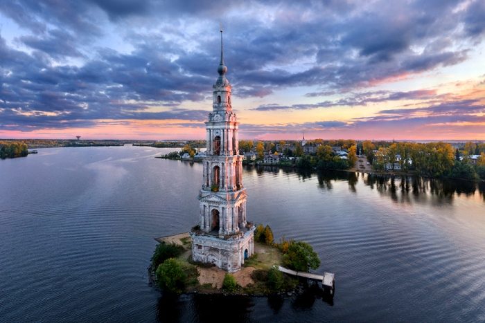 Первая информация о городе Калязин находится в летописях 12 века в качестве монастырского поселения. А к 15 веке он оказался увековечен в тексте знаменитого произведения русского путешественника Афанасия Никитина под названием «Хожение за три моря». Однако и этот город остался только в старых записях да фото. В 1939 — 1940 годах в рамках строительства Угличской ГЭС затоплению подверглась старая часть города. Так, под водой оказались церкви, монастырь и собор, а также торговая площадь, улицы, торговые ряды и купеческие особняки. Единственное сооружение, которое осталось от аутентичного Калязина — это колокольня, которую оставили на поверхности в качестве маяка для барж.