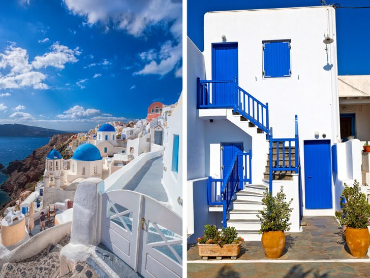 Изюминка острова — особенная архитектура. По большей части строения на Санторини белые, а крыши и ставни ярко-синие. Для местных жителей использование белого цвета имеет не только эстетическую, но и практическую функцию. Большинство зданий выполнены из темного камня, который сильно нагревается под яркими солнечными лучами. Скалистый ландшафт лишен густой растительности, и дома абсолютно беззащитны во время палящей жары. Благодаря белой краске внутри помещений удается сохранить прохладу даже в самый жаркий день. А контрастные синие оттенки добавлены в архитектуру в качестве отсылки к греческому флагу.