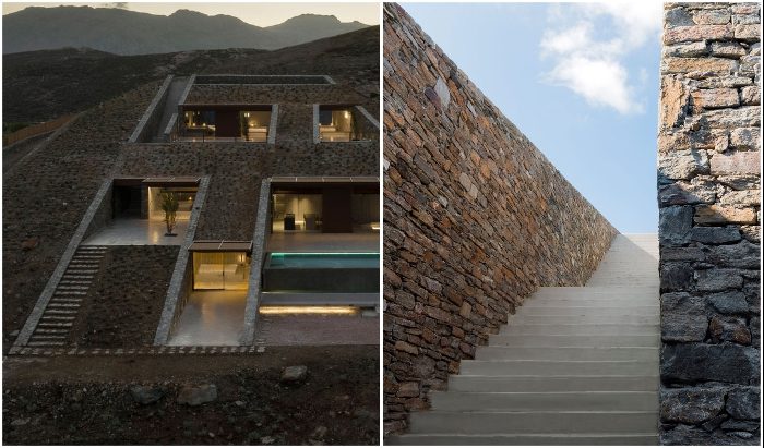 На склоне уединенной скалистой бухты греческого острова Серифос дизайнерская студия Mold Architects завершила строительство подземного особняка Ncaved House. Архитекторам удалось интегрировать в скальную породу трехэтажное жилище площадью 360 кв. м так, что из некоторых точек отличить его от склона нереально. Проектная группа такое необычное расположение объясняет тем, что на побережье Эгейского моря, в районе острова Серифос очень часто дуют сильные северные ветры.
