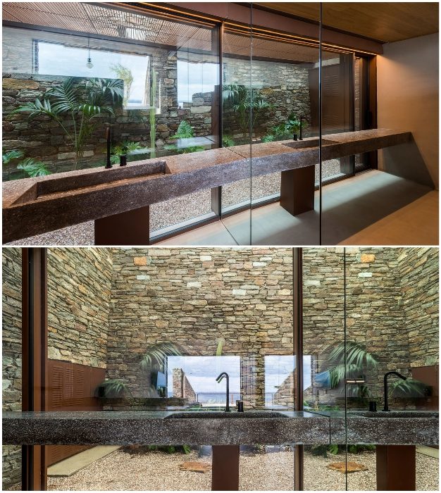 Авторы проекта создали трехмерную «шахматную доску» из каменных стен, ставших продолжением холма, зависшего над морем и пустот, в которых и созданы жилые пространства. А смещение уровней дома относительно центра сооружения усиливает перспективу и обеспечивает внутренние помещения более обширным обзором. Такое интегрирование помогло создать не только особенный визуальный эффект, оно одновременно выполняет естественные изолирующие функции, позволяющие поддерживать внутри особняка относительно стабильную температуру в любое время года.