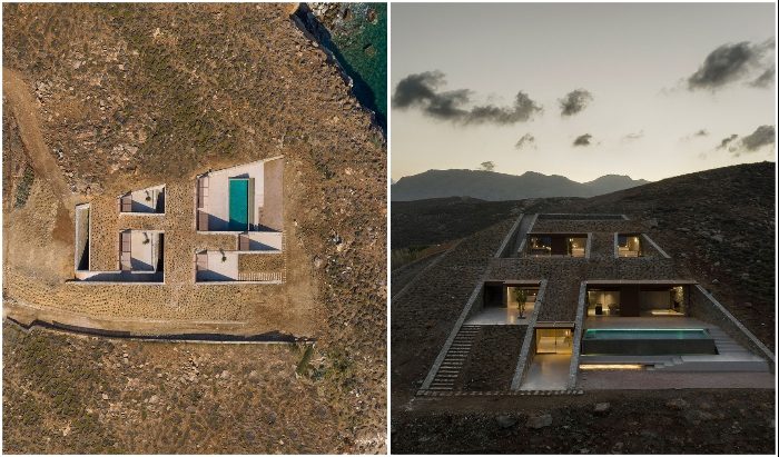 На берегу Эгейского моря завершилось строительство уникального дома, интегрированного в скалистый мыс острова Серифос, парящего чуть выше уровня моря. Особняк-невидимку надежно спрятали в холмистом ландшафте не просто так — архитекторы постарались найти надежное укрытие от сильных ветров, которые буйствуют в этом районе. Несмотря на то, что дом создан без внешней формы, его особенная планировка позволила обеспечить восхитительные виды из окон.
