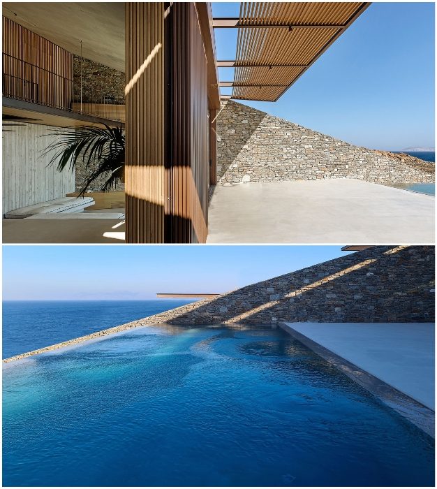 Общая зона отдыха и видовой бассейн расположены на цокольном уровне дома (Ncaved House, о-в Серифос)