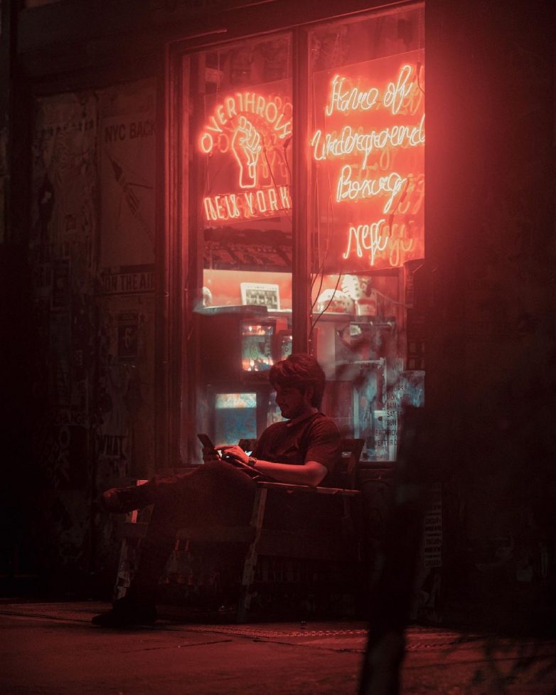 Фотограф говорит: «Я визуальный рассказчик историй, который стремится проецировать новые перспективы мира. На мои фотографии значительное влияние оказывает “Город, который никогда не спит”! Мою страсть можно увидеть в моей работе. Я стремлюсь показать мельчайшие детали, а мой стиль редактирования сильно вдохновлен кинематографическими работами, такими как «Джокер», «Бегущий по лезвию 2049» и «Измененный углерод».