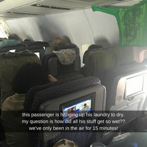 12. «Один пассажир повесил сушиться свою одежду. Вопрос: как он умудрился настолько ее промочить?? Мы летим всего 15 минут!»