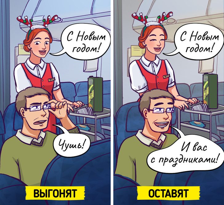 Иногда отсутствие праздничного настроения грозит стать причиной, по которой и без того грустного путешественника могут вывести из самолета. Подобный случай уже имел место в нью-йоркском аэропорту Ла-Гуардия: радостное приветствие дежурного по выходу на посадку не воодушевило горе-пассажира, который заявил, что не все празднуют Рождество. Небольшой конфликт перерос в серьезное столкновение, и незадачливого путешественника под аплодисменты его несостоявшихся попутчиков выгнали из самолета.