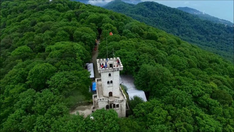 Высота самой башни, выстроенной из тёсаного белого известняка, — 30,5 метров. Судя по снимкам в интернете, оттуда Сочи и Адлер видно как на ладони, но нам немного не повезло — на горе был густейший туман, поэтому черноморские берега удалось разглядеть лишь урывками. Но в этом тоже оказался свой шарм — башня была словно «картинка», сошедшая из фильмов про Средневековье.
