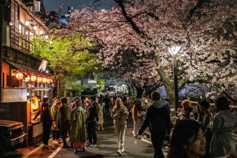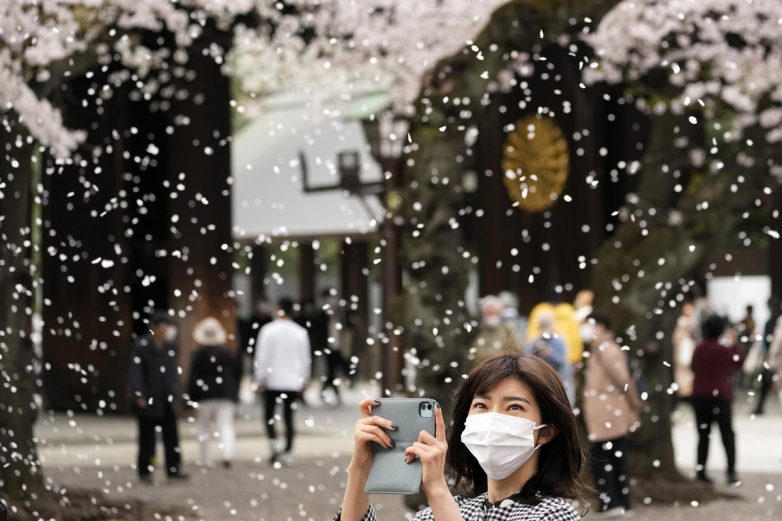 В этом году впервые за два года люди праздновали пик сезона наблюдения за цветением сакуры в Японии без ограничений, связанных с COVID-19. Но многие прогуливаются под деревьями вместо того, чтобы пить и есть в традиционном стиле вечеринок.