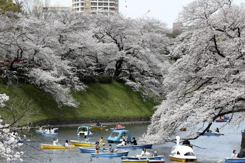 В парке Чидоригафути, знаменитом “ханами” или месте для наблюдения за цветением сакуры к северо-западу от Императорского дворца, тысячи людей любовались пушистыми бледно-розовыми цветами, прогуливаясь под рядами деревьев или с гребных лодок по дворцовому рву.