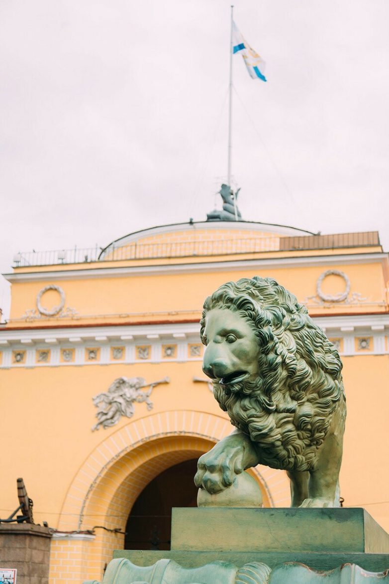 Львы, играющие шарами перед зданием Адмиралтейства, — пожалуй, один из наиболее узнаваемых видов города. Скульптуры отлиты из меди и стоят здесь с 1832 года, с момента основания Адмиралтейства. Как думаете, что это за шары? Оказывается, есть такая античная легенда, что львы-стражи по ночам держат лапу на шаре, чтобы не уснуть. А если задремлет, то лапа скатиться, и он проснется. В общем, если увидите льва с шаром под лапой — знайте, что он на страже и смотрит в оба.
